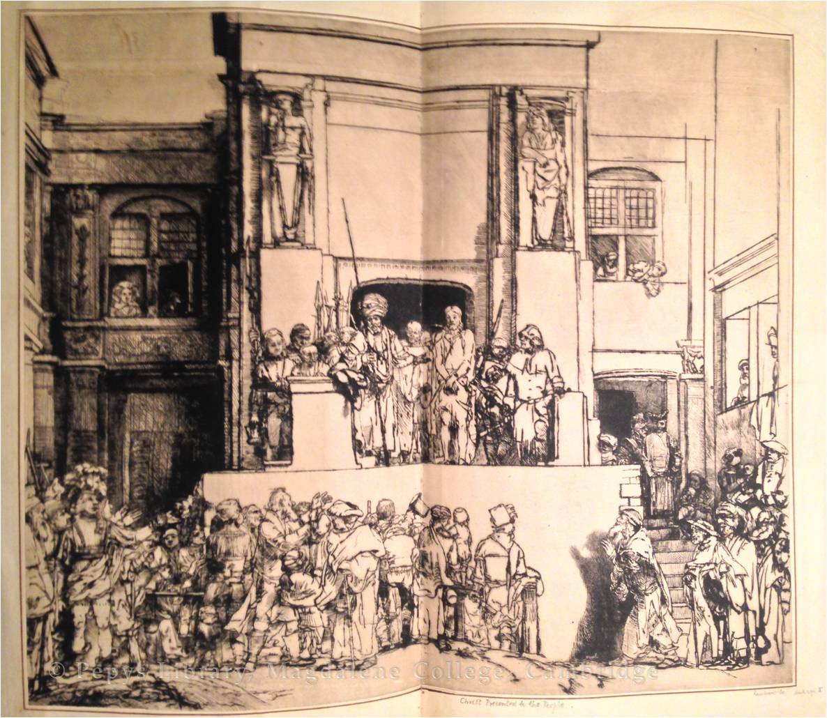Pepys is not considered by experts as a ‘connoisseur’ of prints in comparison to other collectors of the time, such as his great friend John Evelyn. Nevertheless, Pepys managed to collect prints and etchings by notable artists such as Dürer, Raphael, Cranach, Hollar, Rubens and Rembrandt. Amongst the finest prints in the collection are exceptionally early (first ‘state’) impressions of Rembrandt’s ‘Christ Presented to the People’ and ‘The Three Crosses’. These prints appear under the category ‘New Testament’, in part two of Pepys’ album ‘My Miscellany of Prints General’ (PL 2984 pt.ii). The National Gallery in London is currently collaborating with the Rijksmuseum in Amsterdam in hosting a major exhibition of Rembrandt’s work. Therefore, it is an opportune moment to showcase two of the artist’s works from the Pepys Library in our blog, especially because other versions of the two prints illustrated below are appearing in the exhibition.