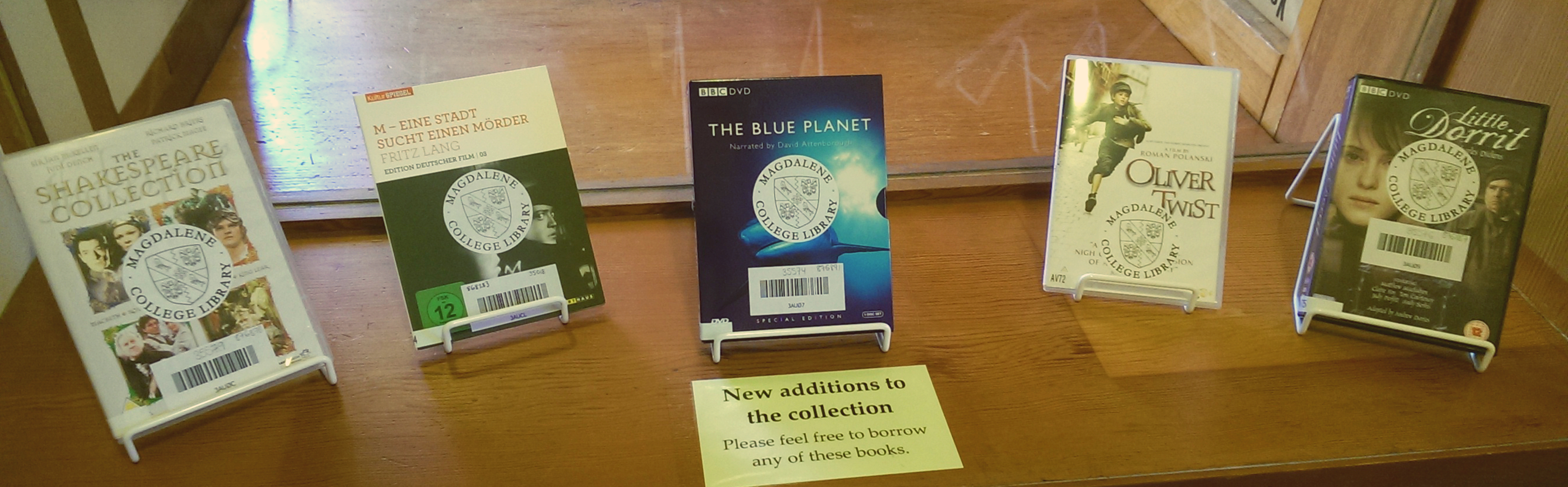 The College Library’s audiovisual collection is small, but growing! We have added lots of films and box sets recently, including the titles in the picture above. As well as DVDs, we have a number of audio CDs and CD-ROMs. These are all shelved in the library office, so please ask a member of staff if you find a DVD or CD on the catalogue that you wish to borrow. Items from the audiovisual collection can be borrowed for one week, and renewed just like books. Whether you’re studying anatomy, Shakespeare, thermodynamics, or Italian, we’re bound to have something for you!
