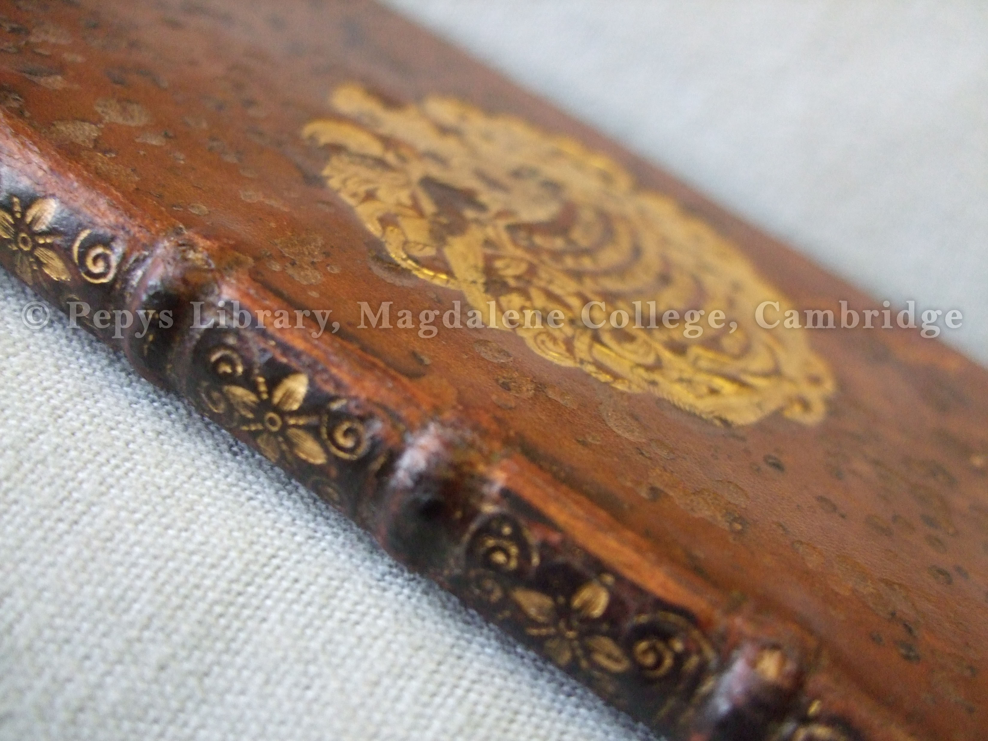 Ayme for Finsburie archers is a rare copy of the 1601 printing and it is handsomely bound in mottled calf bearing Pepys’ armorial stamps and bookplates. It also has gold tooling on the spine and fore-edge with intricate blind tooling visible on the inside front and back boards. This suggests that, although Pepys does not refer to practising archery as an adult in his diary, Ayme for Finsburie archers was an important book to him.