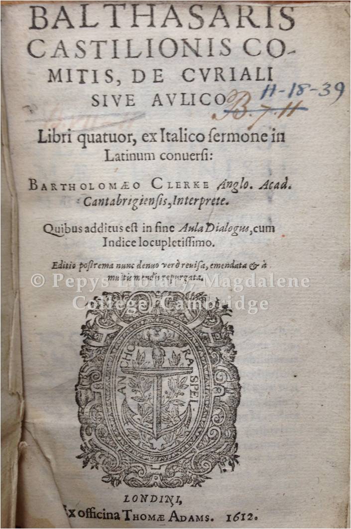 Old Library H.18.39: Balthasaris Castilionis comitis, De curiali siue aulico libri quatuor, ex Italico sermone in Latinum conuersi: Bartholomæo Clerke Anglo. Acad. Cantabrigiensis, interprete. Quibus additus est in fine Aula dialogus, dum indice locupletissimo.
