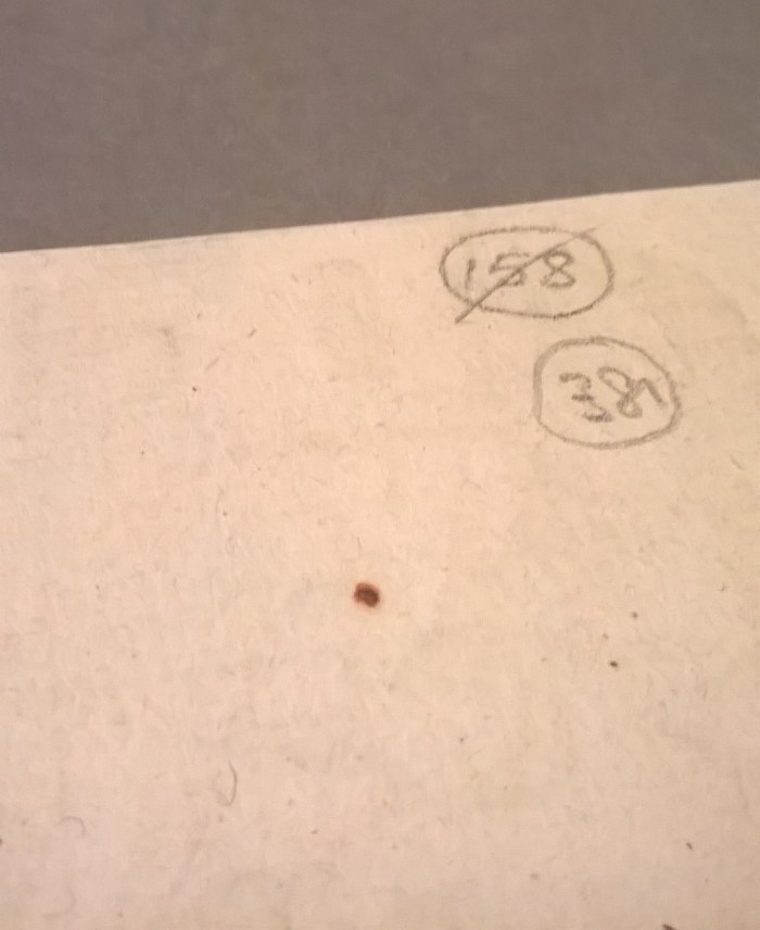 Papermaking machines were not developed until the early years of the Industrial Revolution, so the paper on which Nicholas Ferrar’s prints were produced is all handmade. Papermaking in the early modern era was a highly skilled craft requiring a team of workers operating in careful collaboration. The basis of paper is cellulose, which can be obtained from various organic materials. Today the main source is trees but most early modern European paper was made from cotton and linen rags, which were beaten in water to produce a vat of fibrous pulp. It was difficult to filter the pulp and it often ended up containing impurities that were transferred to the paper, such as human hairs or small shards of metal that rust over time (Fig. 1).
