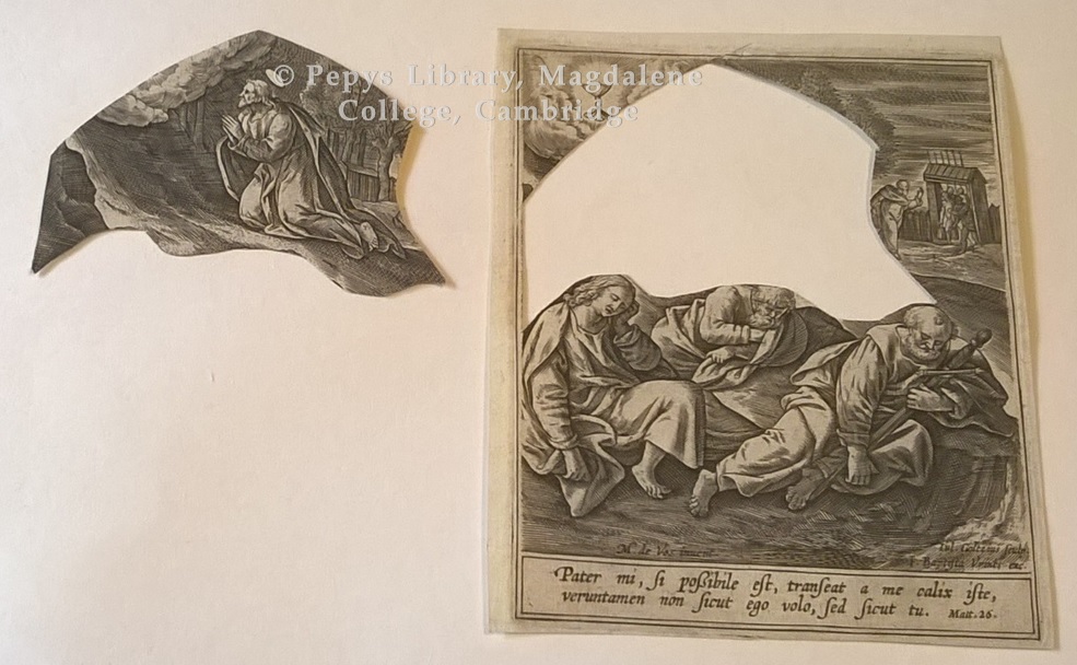 The Ferrar collection has an interesting history, which close observation of the prints helps to reveal. The prints were collected by Nicholas Ferrar when he was travelling in Europe during the early seventeenth century. The majority illustrate stories from the Bible, although there are also prints based on classical mythology and portraying different trades of the day such as printmaking and alcohol production. Once they arrived in England the prints were not left pristine and untouched. The Ferrar children cut out sections of the prints in order to produce a ‘Harmony of the Gospels’ – a scrapbook depicting biblical stories (Fig. 5).