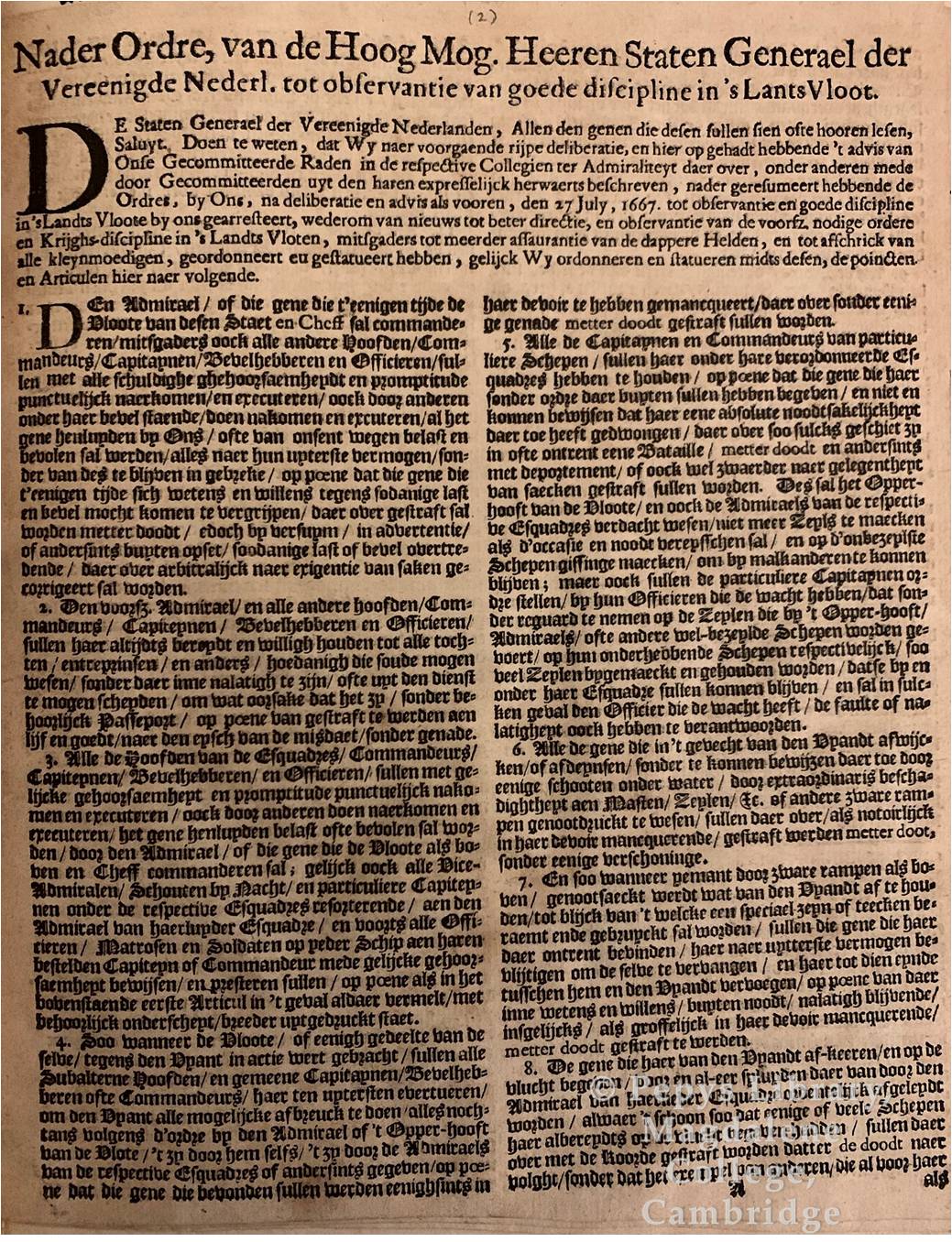 ‘Nader ordre…’ is a state publication concerning the maintenance of good discipline on the Dutch fleet of ships. As Secretary to the Admiralty under Charles II and James II, Pepys would have taken a professional interest in this publication. However there was evidently a language barrier with the printed Dutch: Pepys had ‘Nader ordre…’ bound with a handwritten translation of the publication into French, a language with which he was much more familiar.