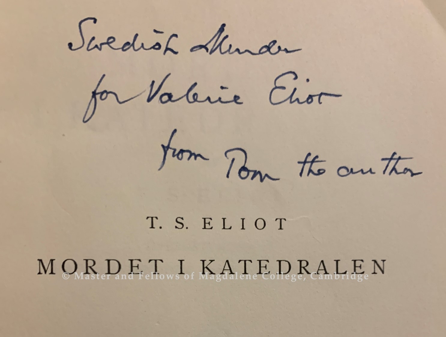 There is a diverse selection of languages represented in these translations of Murder in the Cathedral, a testament to Eliot’s literary success. We see Kannada, Malay, Gallego, Friulian and Welsh represented amongst many others. Illustrated above is an inscription by TS Eliot to Valerie Eliot in a Swedish translation.