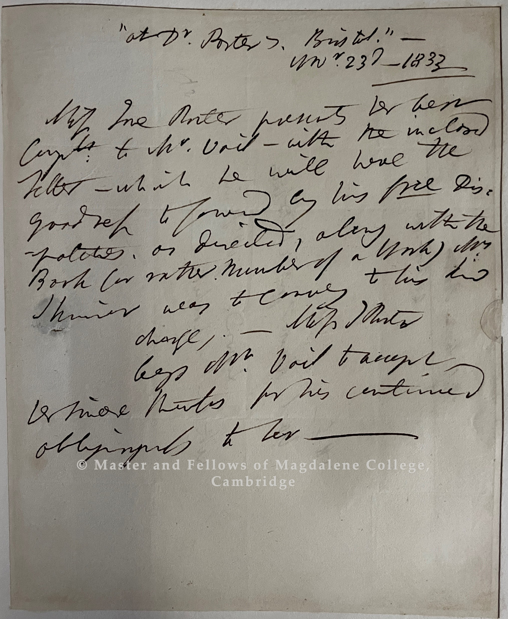 Porter’s letter to Vail is a somewhat typical example of those with diplomatic responsibilities being called upon by friends and acquaintances to send correspondence to their home countries. Jane asks that Vail would have ‘the goodness to forward by his free dispatches’ a letter she encloses. Porter’s need to economise was particularly prominent at the time of her writing this letter in the winter of 1833. Her sister Maria had died the year before, and therefore they could no longer share their incomes. Jane addresses her letter from ‘Dr Porter’s, Bristol’, referring to her brother William Porter and his wife Phoebe, with whom she stayed most winters.[v]