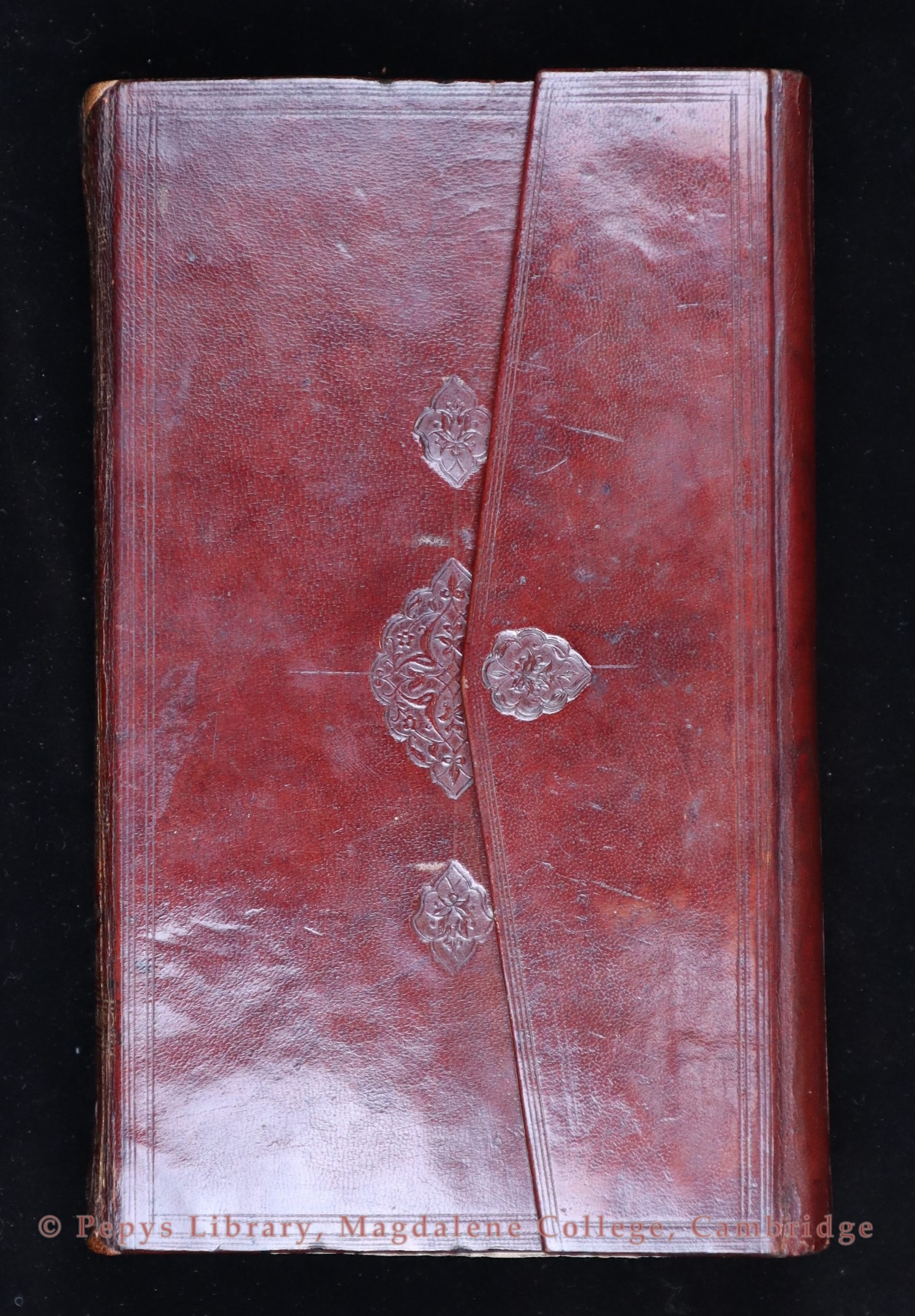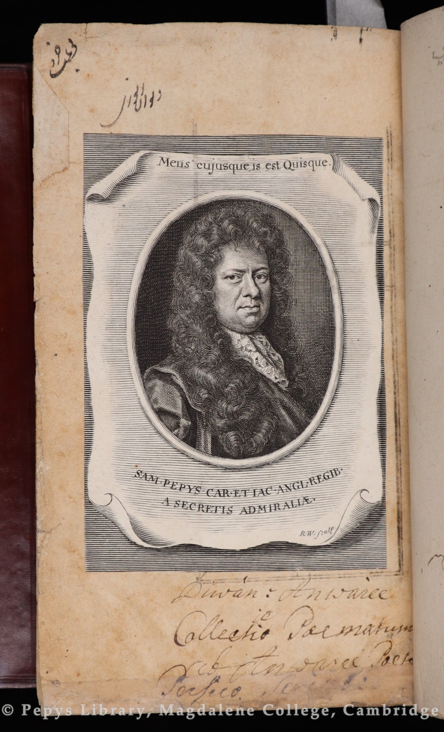 Pepys Library 1281 is a curious manuscript. Its spine is gilded and decorated to conform with the other volumes in the collection, and so a visitor to the great diarist’s library might not have given it a second glance. On removing it from the shelf and examining it more closely, however, their interest might have been piqued. The binding, which is original and in excellent condition, is of maroon leather on pasteboard, with an envelope flap – an additional piece of board attached by a flexible join to the back cover, which sits between the front cover and the fly-leaf to protect the codex. This is a common feature of Islamicate bookbinding. The front and back covers are also atypical for the library, being decorated with a central mandorla and detached pendants containing floral motifs in relief, while the flap has a single pendant. On opening the volume, one sees Pepys’ bookplate, and his inscription: “Diwân i Anwarèe, i.e. Collectio Poematum ab Anwaree Poetâ Persico scr[ipta]” (‘The dīvān of Anvarī, i.e. a collection of poems written by the Persian poet Anvarī’).