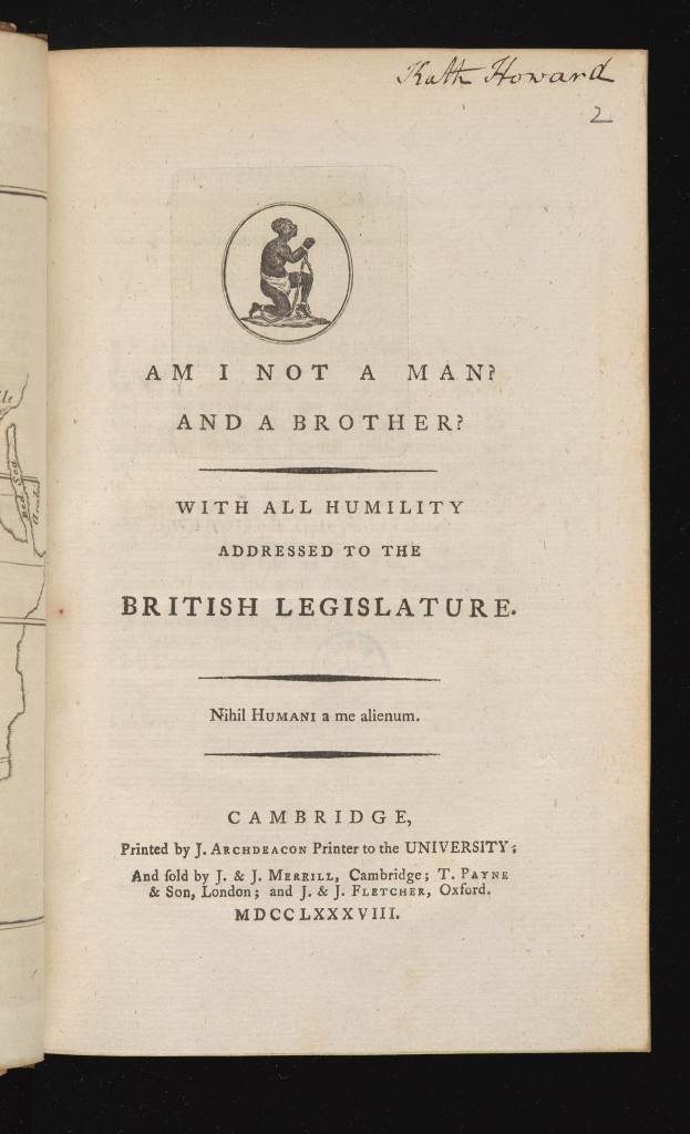 Am I not a man? And a brother? – with all humility addressed to the British Legislature (Cambridge, 1788): this 100-page pamphlet by Peckard was published anonymously, the author believing this would be more effective. After rehearsing the arguments for abolition, he then examined at length – using his extensive reading about Africa – such things as African capacity for music, poetry, medicine, religious understanding and moral exhortation, so that it could be clearly proved that Africans are men, with sensitive capabilities entirely comparable with those of Europeans. He especially praised the writings of Ignatius Sancho and the poetry of Phillis Wheatley, as part of this major investigation.