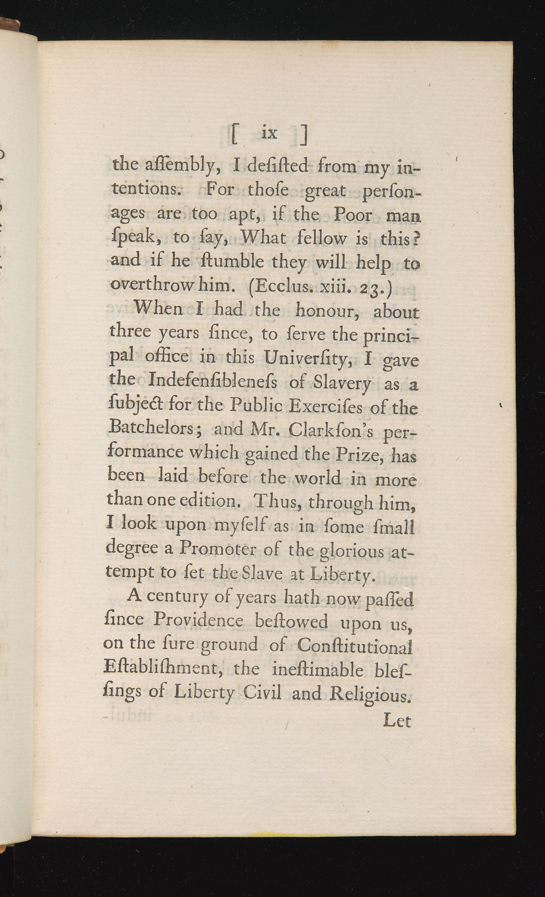 Peckard was increasingly feeling his age, and proud that Clarkson became in a sense his instrument: ‘thus, through him, I look upon myself as in some small degree a Promoter of the glorious attempt to set the Slave at Liberty’ (1788).
