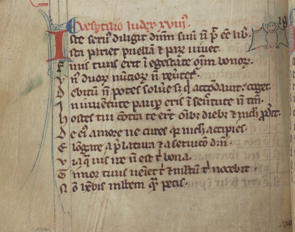 One of the Sortes texts in the manuscript, Prenostica Pitagorice, is illustrated with a charming series of bird illustrations. Prenostica Pitagorice consists of a list of thirty-six questions, with each question asked to a different species of bird. The birds are illustrated answering their respective questions. However, one of the ‘birds’ depicted in the manuscript is, in fact, a bat. Isadore of Seville (c.560-636) states in his Etymologies that a bat ‘in appearance…is a quadruped at the same time as being equipped to fly; this is not usually found among other birds.’[ii] The notion that a bat was a type of bird, though with some distinct differences, continued for several centuries. In a manuscript entitled Liber de natura rerum, contemporary to the production of PL 911, the author Thomas of Catimpré (bef.1203–1272) discusses the bat in his chapter on birds – an image of which can be seen in the digitised manuscript from the Bibliothèque Municipal de Valenciennes, France.
