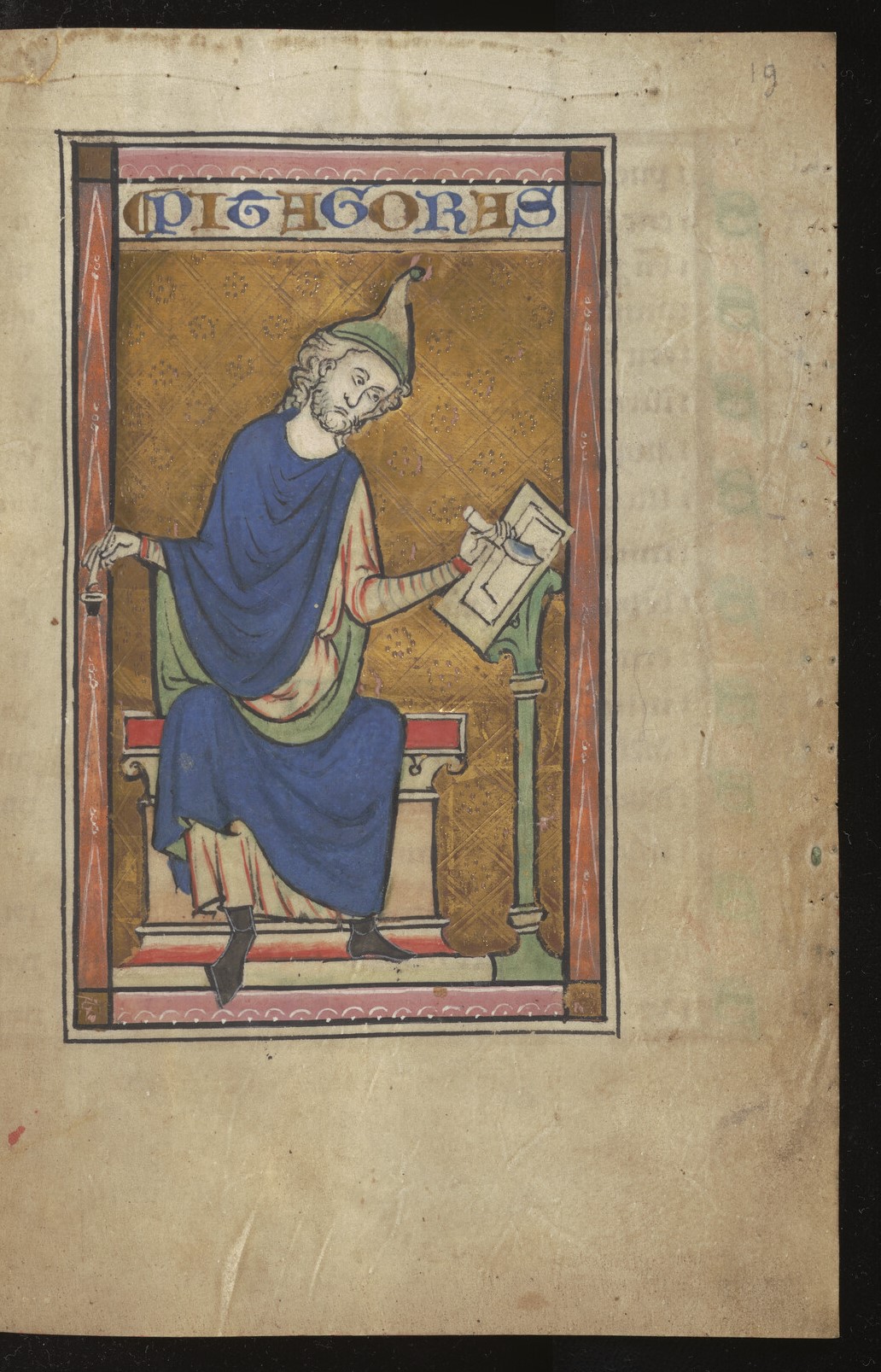 PL 911 comprises one poem and five Sortes texts. The poem, entitled ‘Experimentarius’, is a placed at the beginning of the manuscript and is attributed to the 12th century philosopher Bernardus Silvestris, whose work influenced Chaucer and Dante. Of the Sortes texts, some have been erroneously credited to classical authors. In the illustration on folio 19r we see a portrait of Pythagoras on a gold background, who is one such figure to have been mistakenly identified.