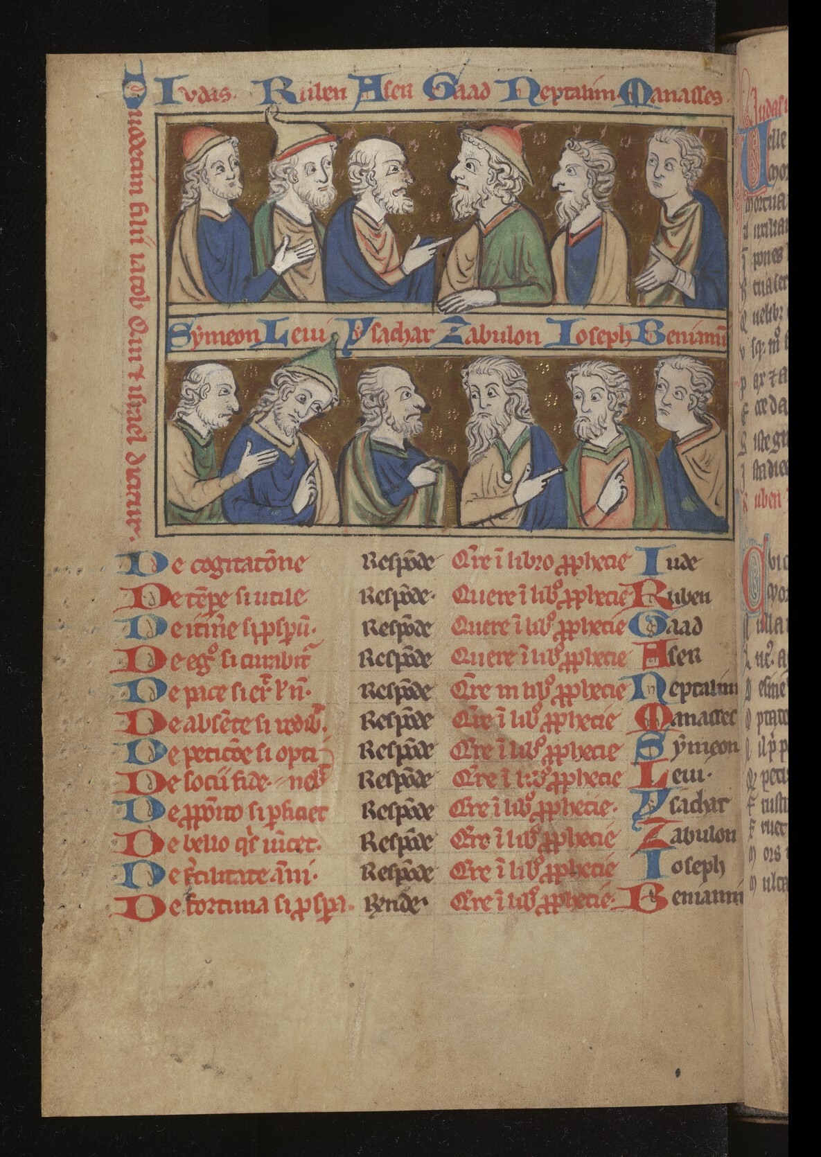 Another fine illustration in PL 911 is that of the twelve sons of Jacob. In a manuscript at the Bodleian Library (MS. Ashmole 304), there is a very similar illustration of the twelve, contributing to a strong body of evidence showing that the two manuscripts are closely related.