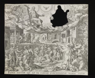 One excised print is Pater Noster qui es in coelis, the first of a series depicting scenes from the Lord’s Prayer, published by Carel Collaert (1598–1654) in Antwerp in the late sixteenth century. The figure of God has been carefully cut out from the sky. Whilst excisions by the Ferrars were largely used to accompany text for their gospel harmonies, excisions were also made for other reasons. For example, God was commonly excised by the Ferrars because using the image of God for worship was prohibited by some Protestant interpretations of the Second Commandment, but the prints Nicolas Ferrar had collected were predominantly Catholic. The engraver of this print was Johannes Wierix (1539-1620), whose work played an important propagandist role in the Counter Reformation in the southern Netherlands. The Ferrar’s excision in the print led it to be exhibited in Tate Britain’s ‘Art Under Attack: Histories of British Iconoclasm’ (October 2013-January 2014)[ii].